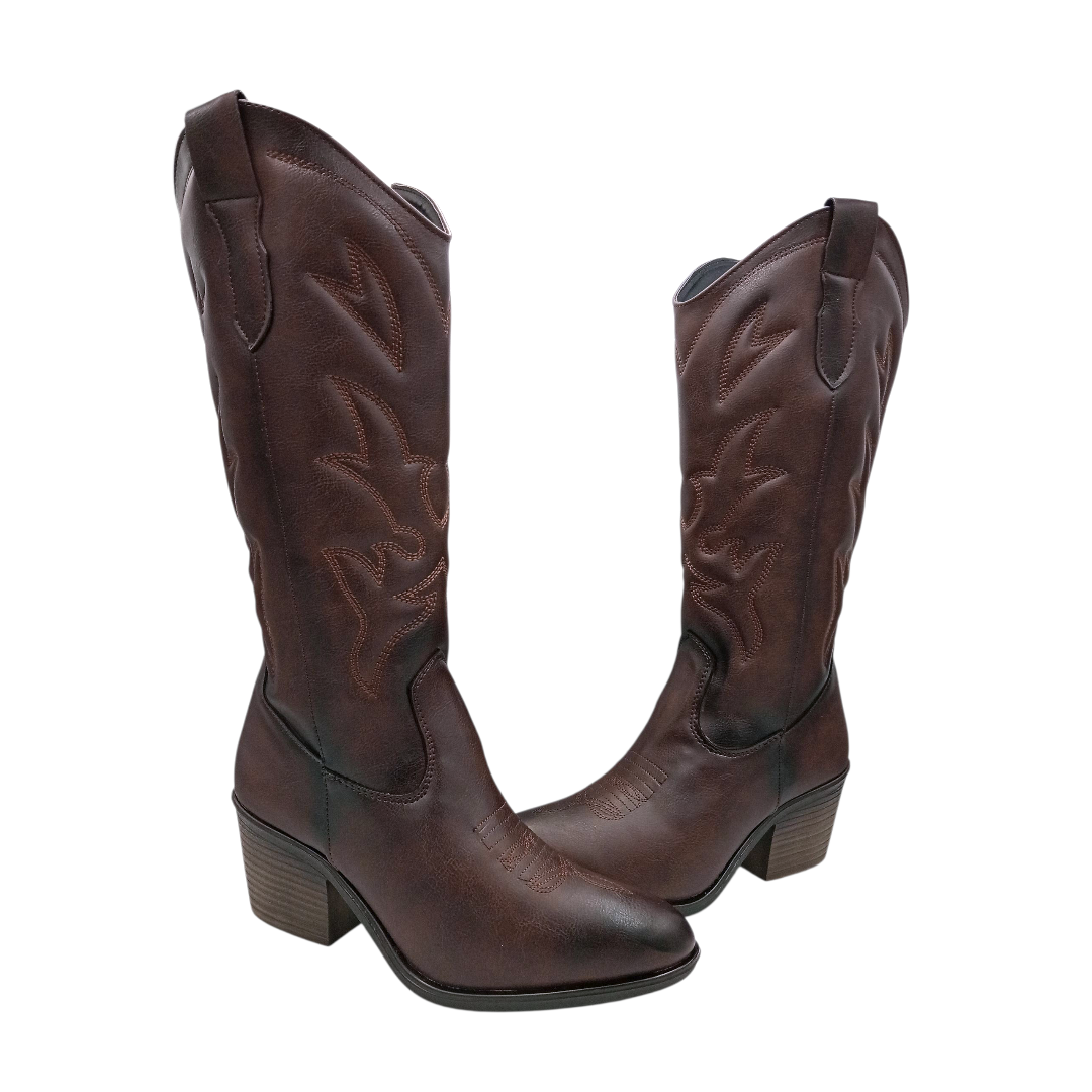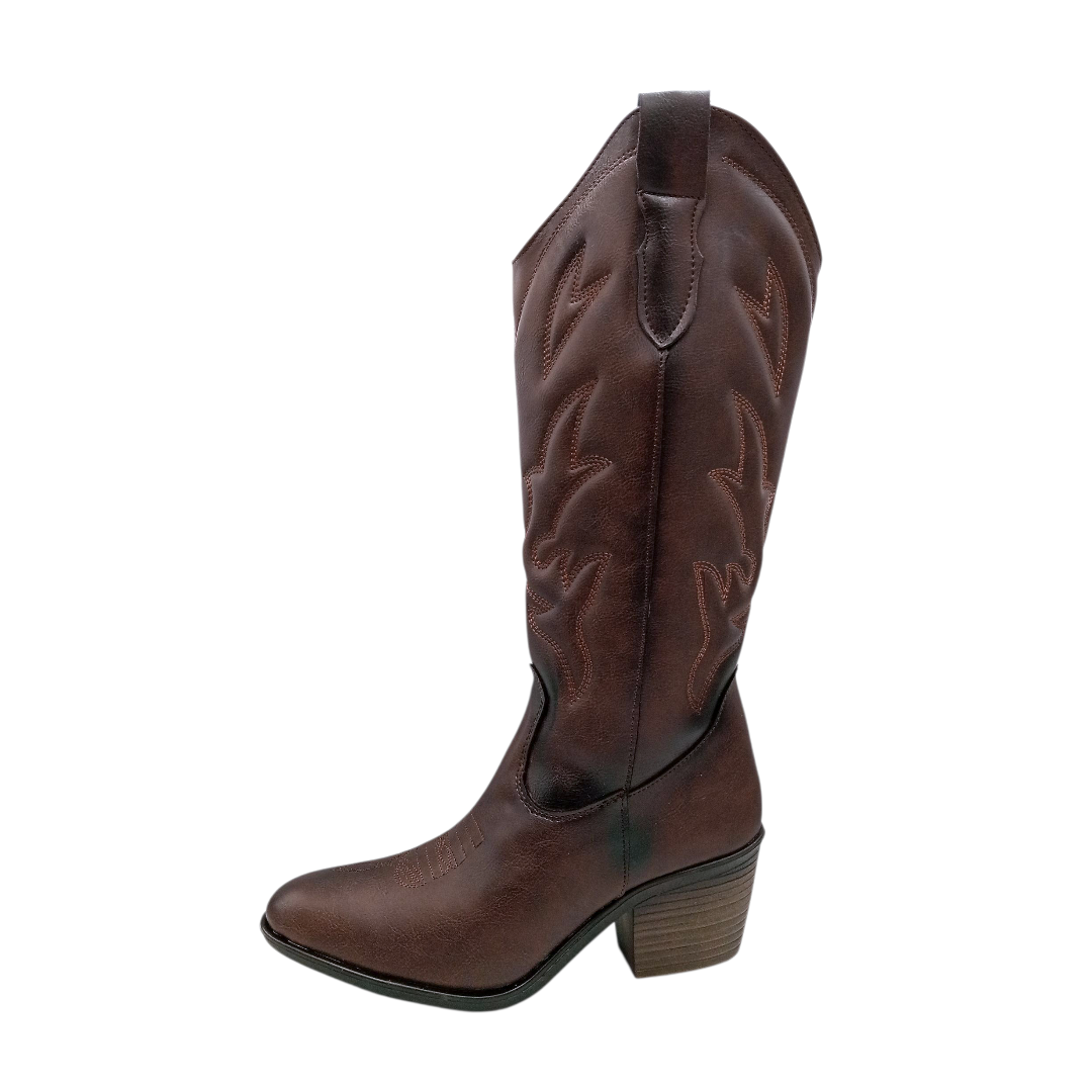 Presentan un diseño liso con detalles grabados en la caña, son de caña media, llegando a 3/4 de la pierna, su color es marrón, lo que las hace versátiles para combinar con diferentes atuendos, tiene tacón tipo cubano, que proporciona comodidad y un estilo western.