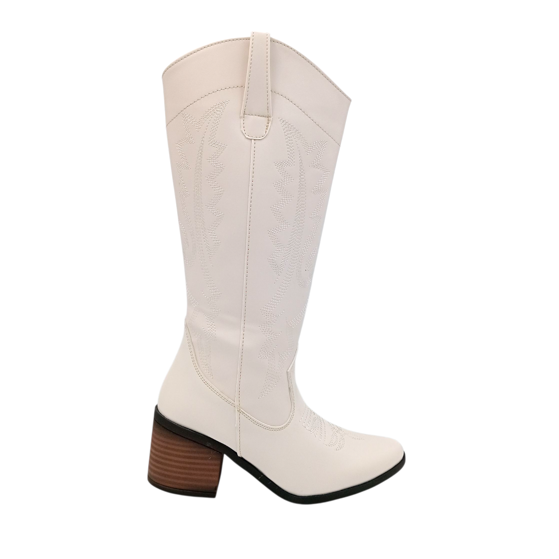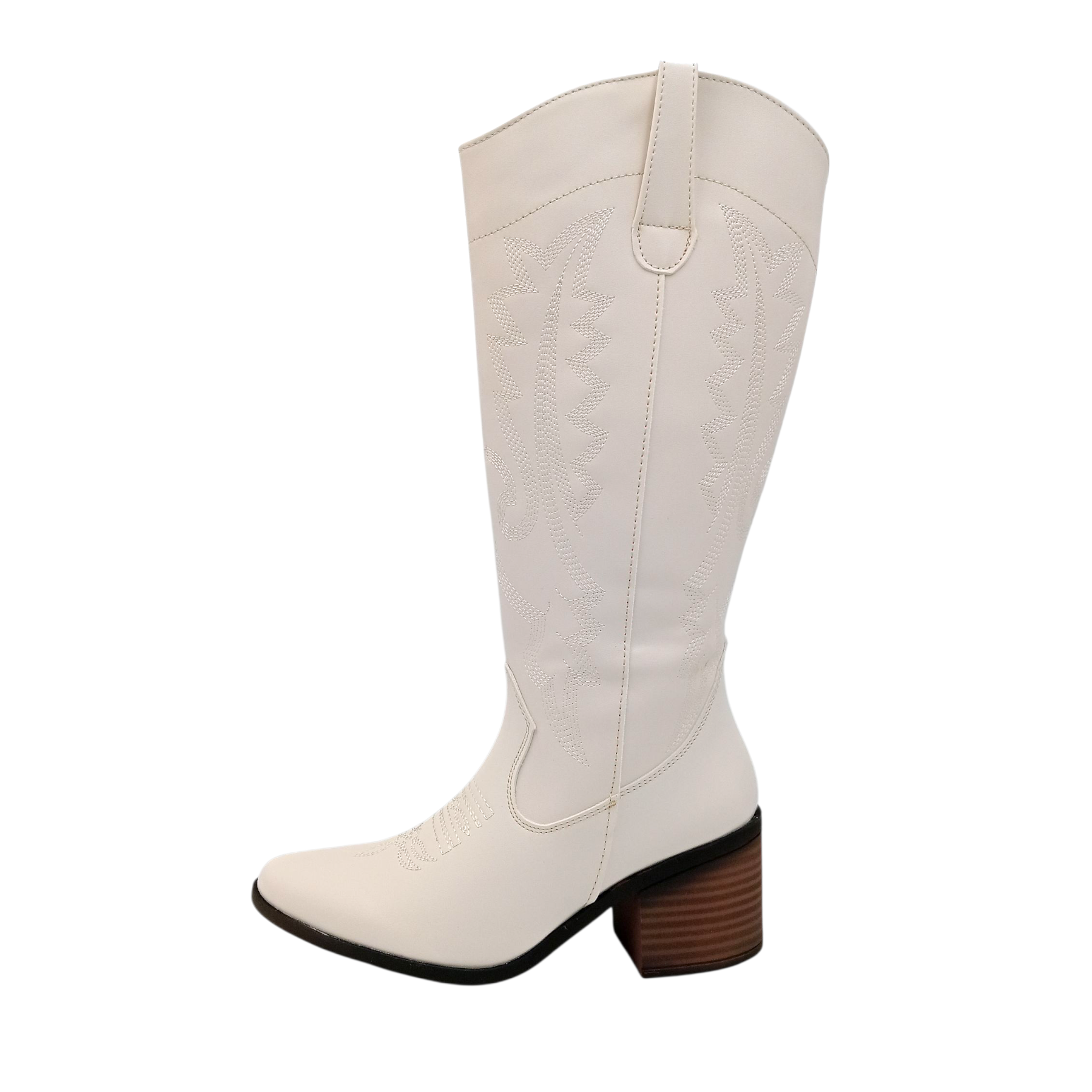 Botas vaqueras de tubo alto con un diseño clásico, presentan un patrón bordado clásico en la caña, puntera de almendra y tacón de imitación de madera. Suele incluir un forro cómodo con cierre en el lateral para facilitar su uso.