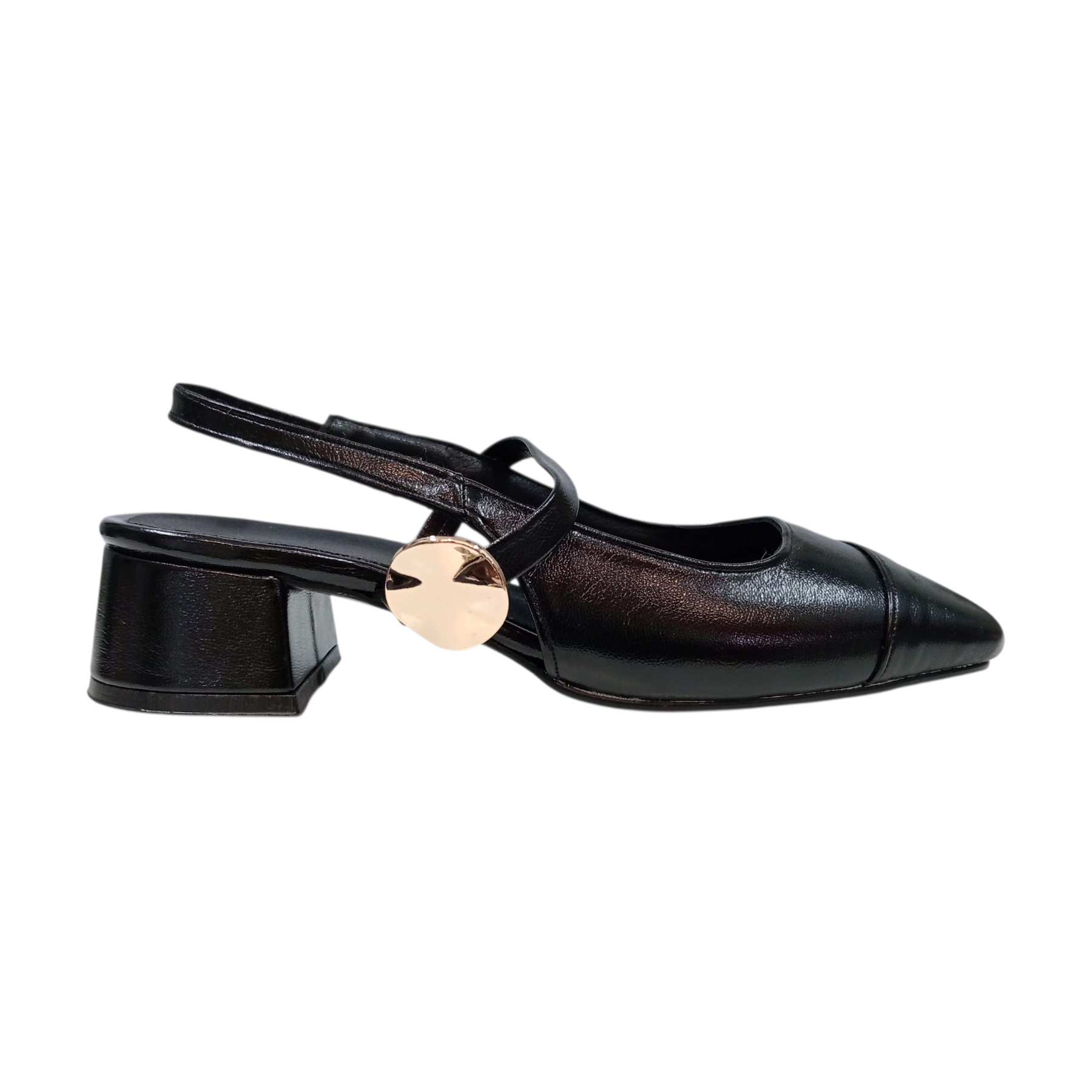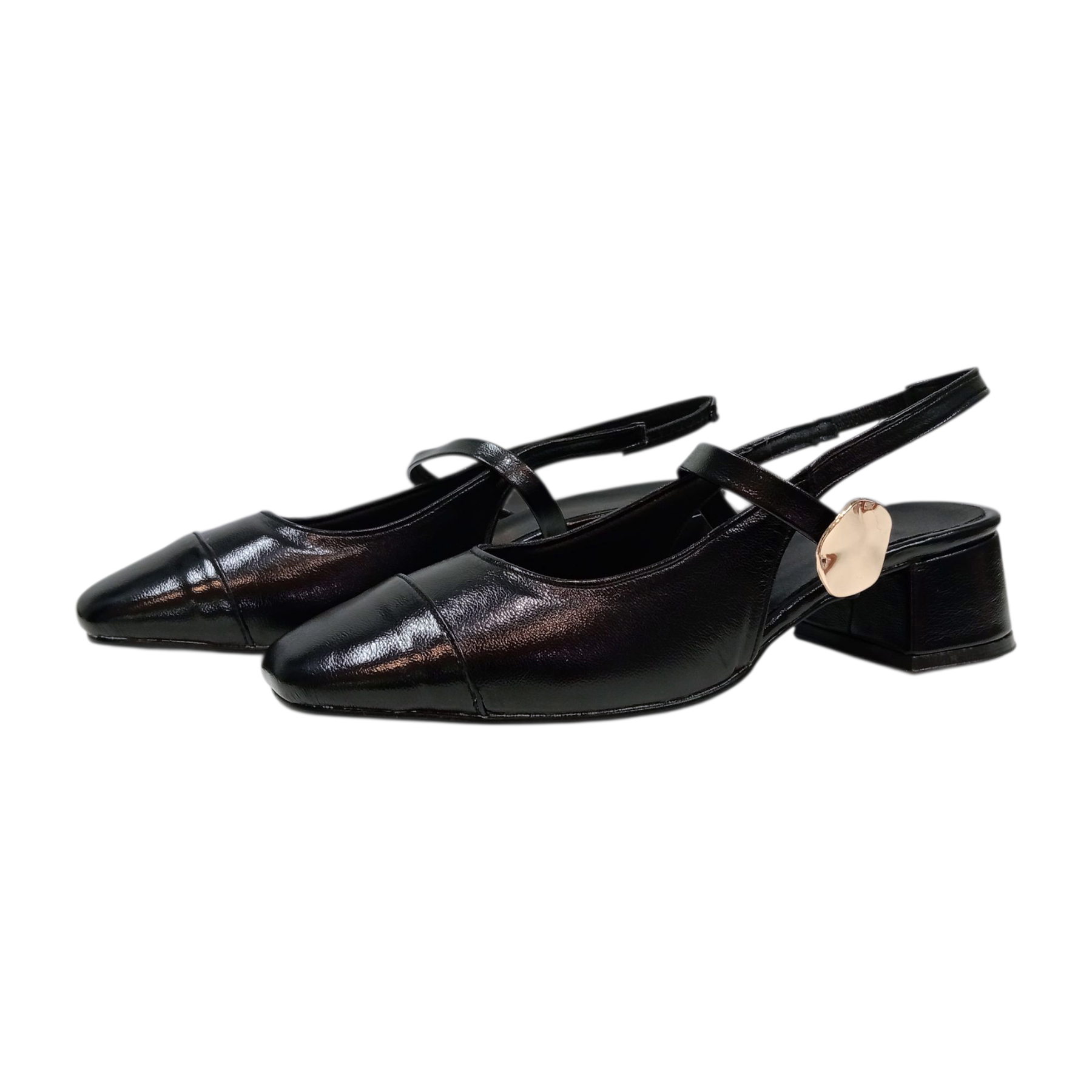 ¡Estilo atemporal con un giro moderno! Presentamos nuestros zapatos negros estilo Mary Jane con punta cuadrada. El acabado brillante tipo charol captura la luz, mientras que la silueta destalonada y el detalle dorado de la hebilla los mantienen a la vanguardia de la moda. Ideales para elevar cualquier atuendo al instante.
